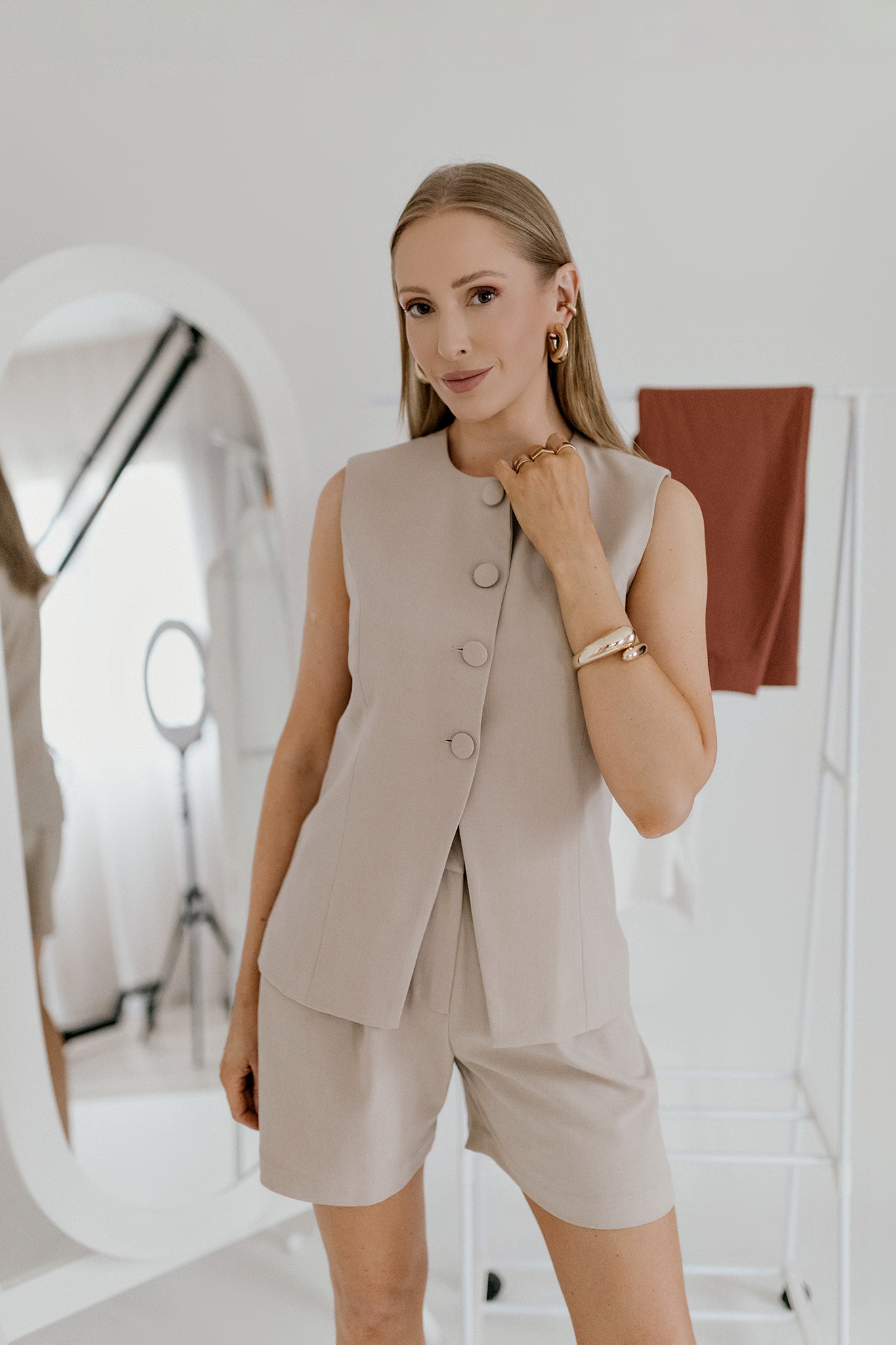 Colete com botões forrados e fenda, confeccionada em um tecido maleável e confortável.